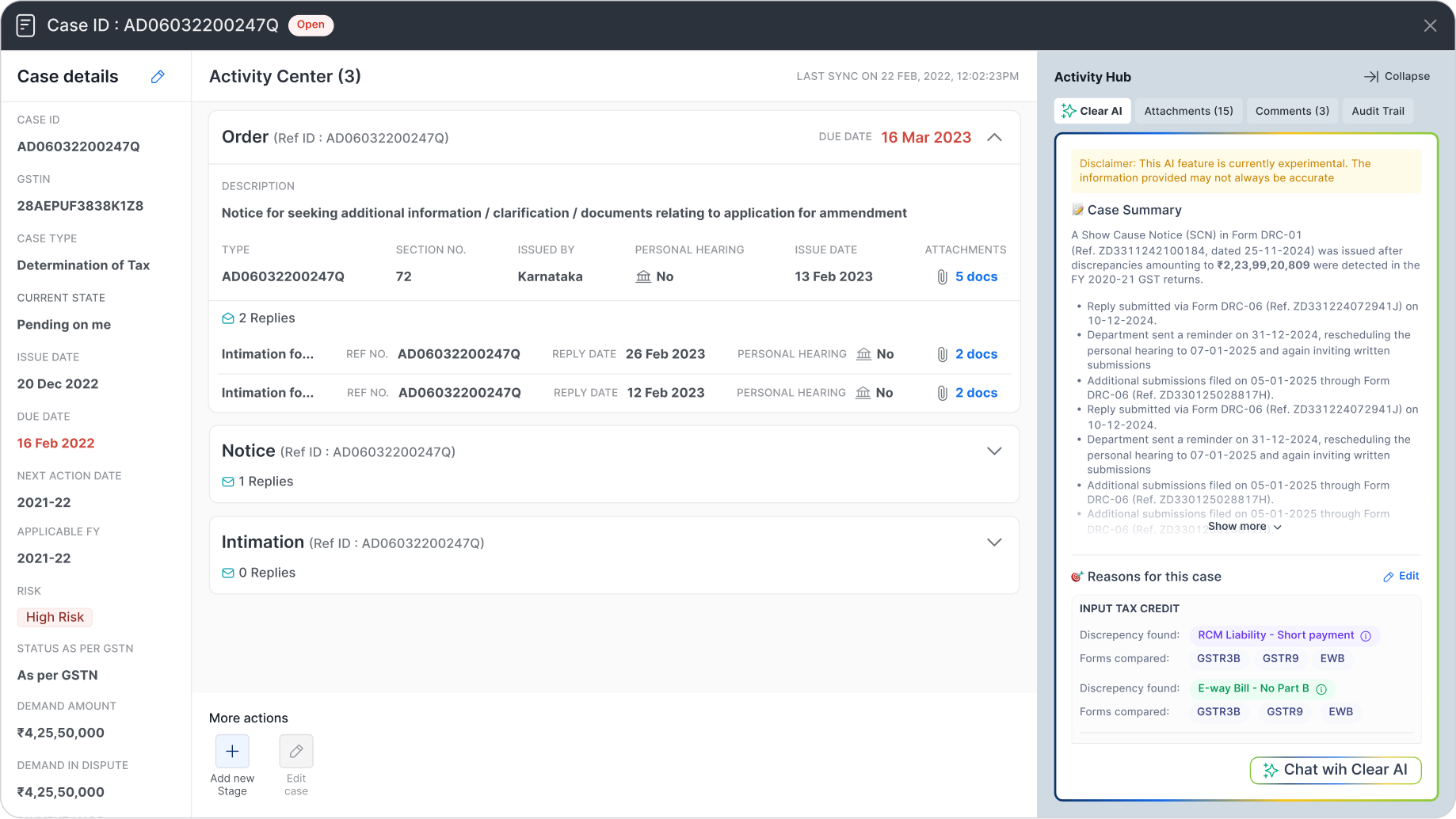 - Managing Complexity with Care: Recognising this page could be overwhelming, I designed each stage (Intimation, Notice, Reply) as a collapsible card. By default, only the latest stage is open, dramatically decluttering the view and focusing the user on the most recent action.